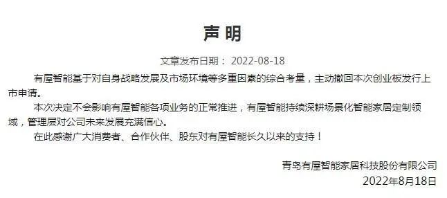 深交所最新消息顯示,青島有屋智能家居科技股份有限公司8月18日已主動申請撤回本次創(chuàng)業(yè)板發(fā)行上市申請文件。相關(guān)公告掛網(wǎng)后,有屋智能也于第一時(shí)間發(fā)布聲明表示,“有屋智能基于對自身戰(zhàn)略發(fā)展及市場環(huán)境等多重因素的綜合考量,主動撤回本次創(chuàng)業(yè)板發(fā)行上市申請。本次決定不會影響有屋智能各項(xiàng)業(yè)務(wù)的正常推進(jìn),有屋智能持續(xù)深耕場景化智能家居定制領(lǐng)域,管理層對公司未來發(fā)展充滿信心?!?/span>